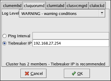 Ping Interval or Tiebreaker IP — Ping Interval is used for a disk-based heartbeat; specifies the number of seconds between the quorum daemon's updates to its on-disk status.