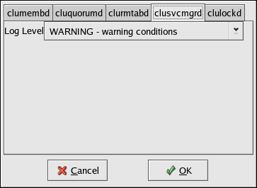 Log Level — Determines the level of event messages that get logged to the cluster log file (by default /var/log/messages). Choose the appropriate logging level from the menu. Refer to Section 3.12 Configuring syslogd Event Logging for more information.